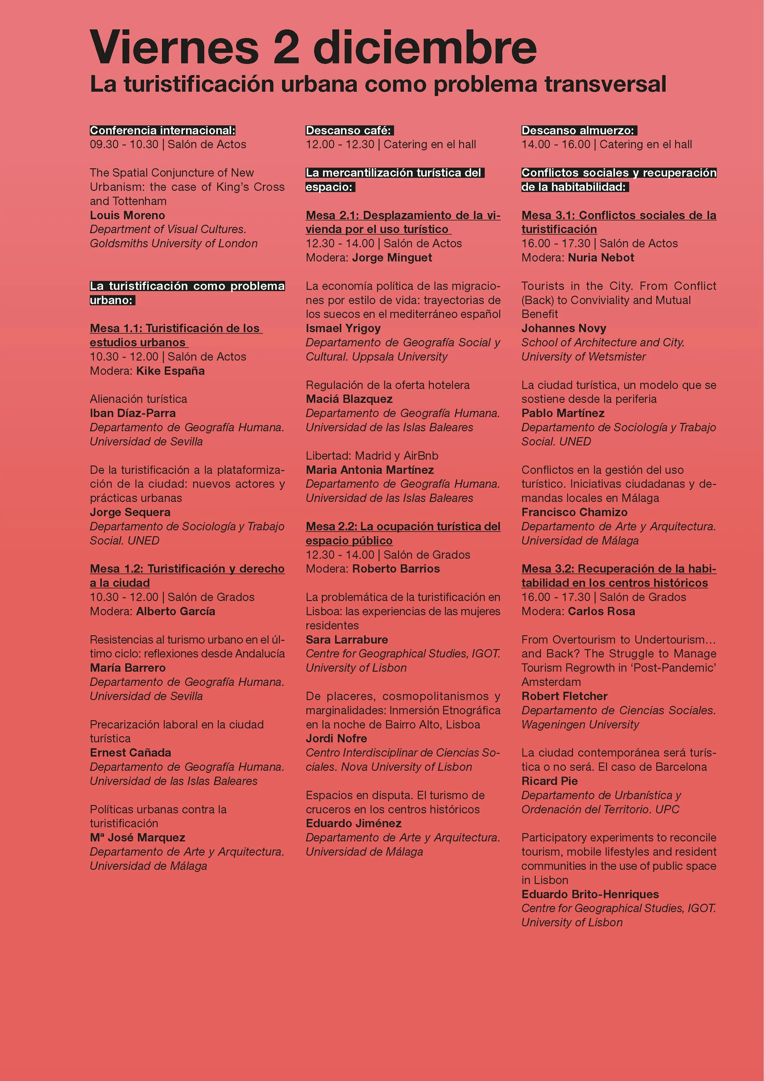 I will be giving a talk in early December at the international conference “Overtourist City” at the Escuela de Arquitectura de Málaga on “Tourists in the City. From conflict (back) to conviviality and mutual benefit”.
